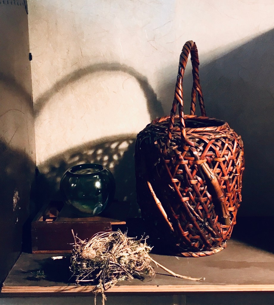 When I broke for lunch, I saw a small woven basket that I had bought recently. The blue color caught my eye and I wondered if it’d look good in the new set-up. Above you can see it.