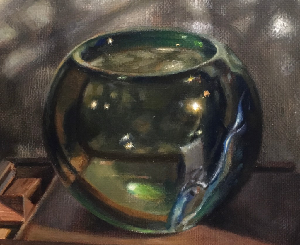 I like the effect of the changes. In person, the canvas looks markedly different now. I haven’t abandoned the idea of glazing the dark areas darker, but I’ll live with this version for a while before I decide.