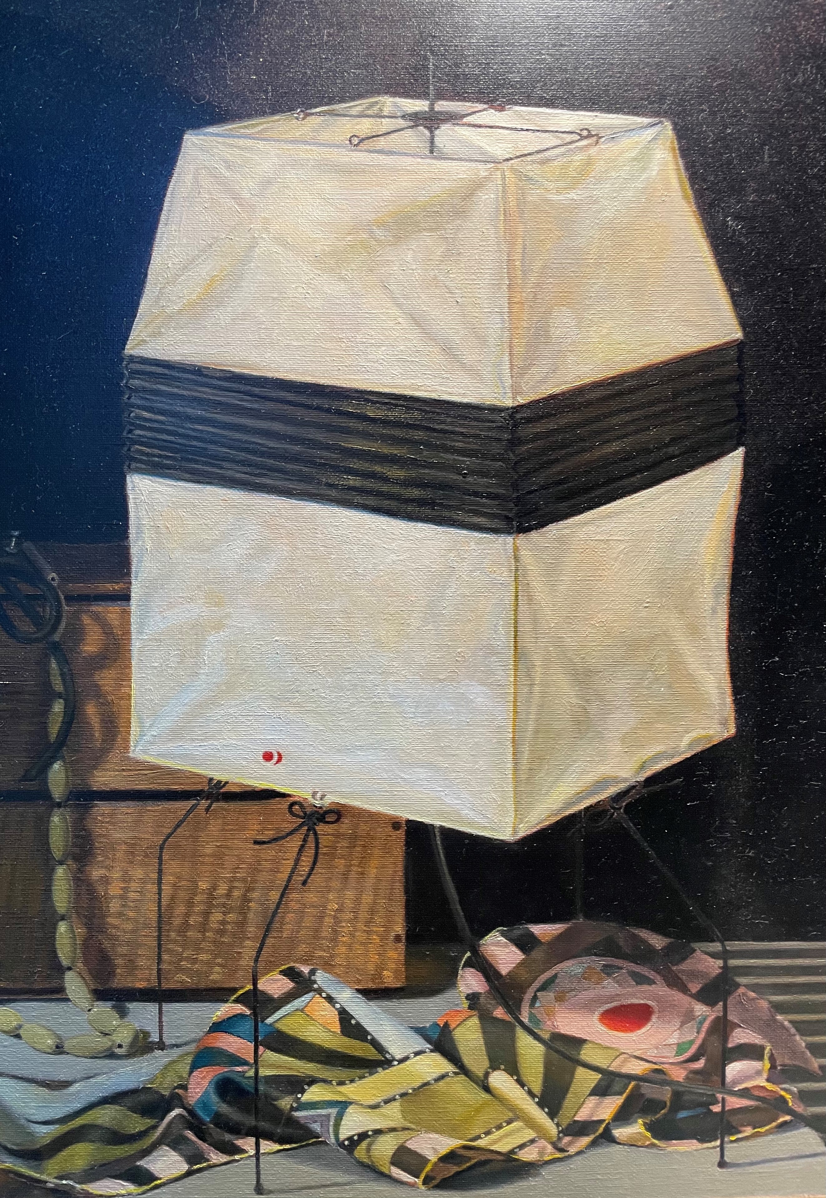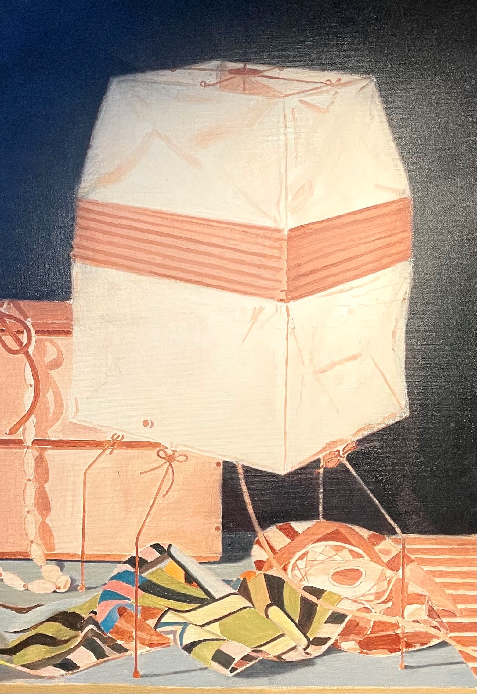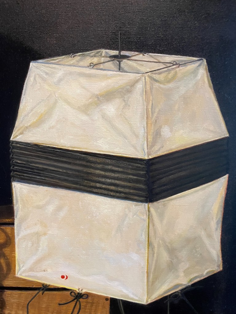 My biggest challenge in painting the paper lamp is making it appear lit from within. Interestingly, the black band covers the brightest part of the lightbulb, so it has to glow, but in a much more subdued way than the white parts. Below is the underpainting.