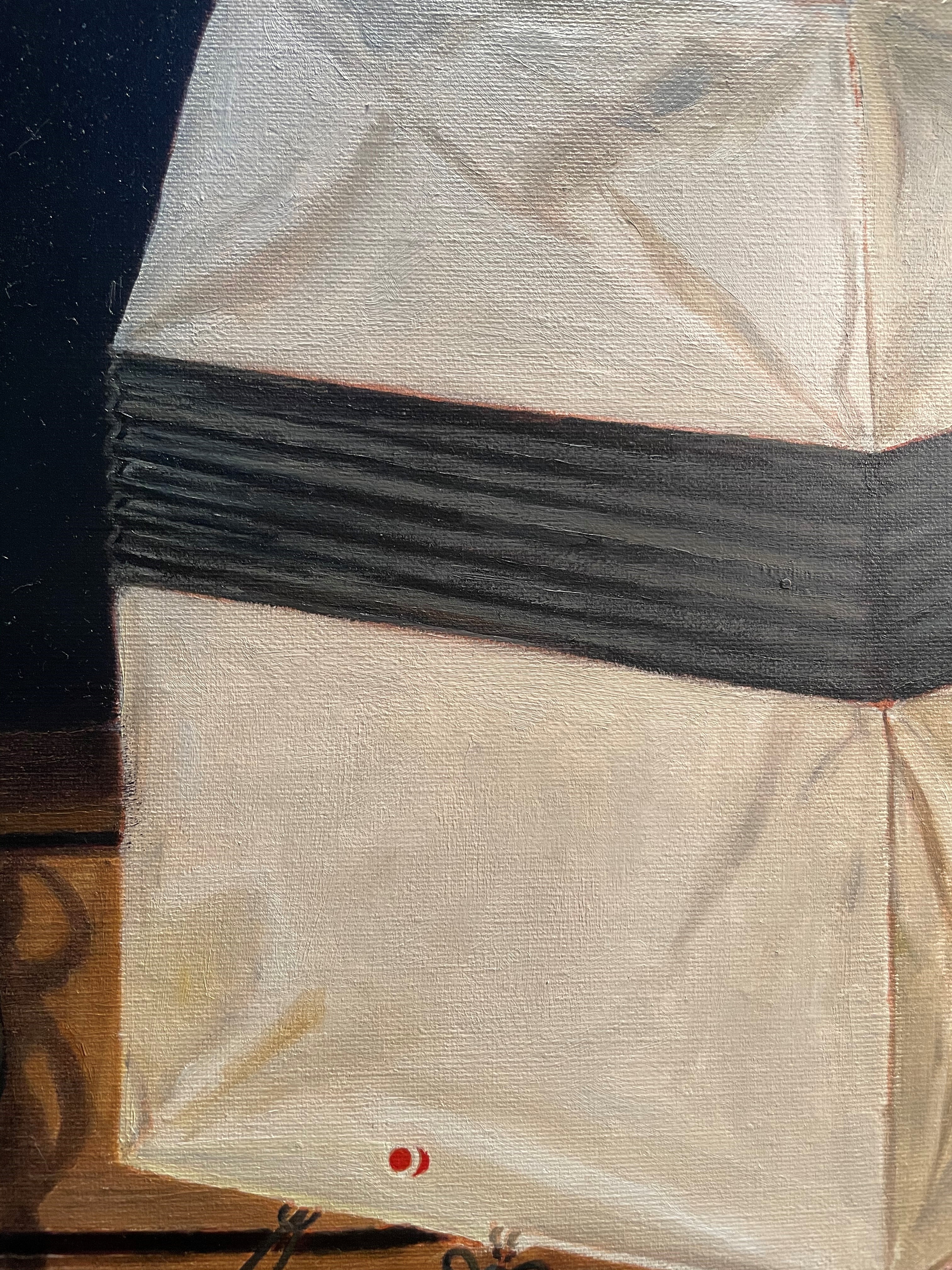 Below, at my next session, I scumbled in some of the lights in the dark band. I’m not happy with the effect, so I’ll keep working on it. I went over the white parts, making the darks more subtle, and observing the wrinkles more carefully. Every time I return to a section of the painting, it’s easier to see more and refine. That’s one reason why I don’t attempt to finish an area all in one go. I learn as I paint, and the more structure that is on the canvas, the easier it is to add to it.