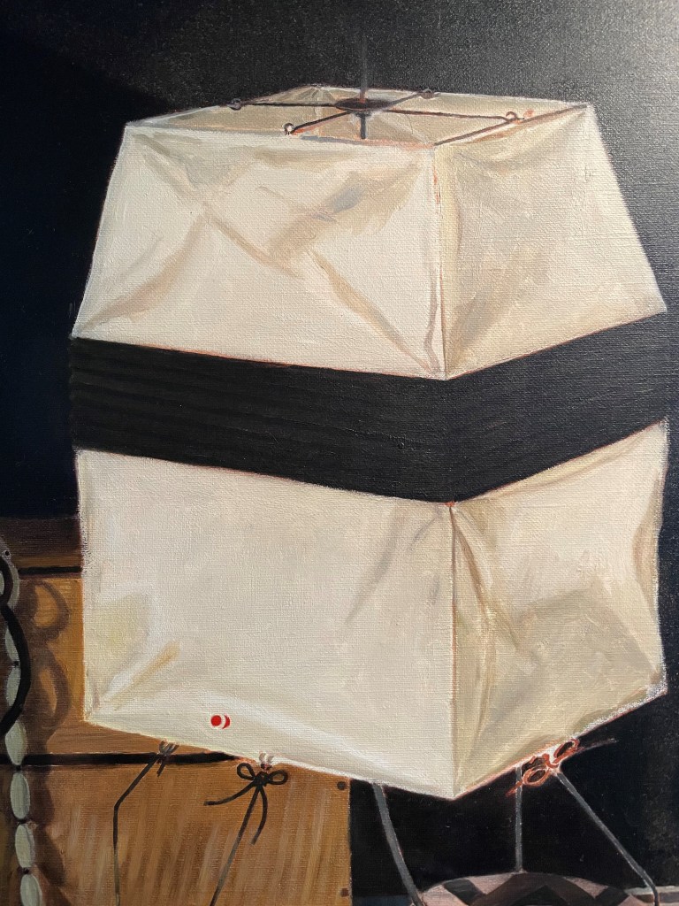 I scumbled some more lights in the black band. I also added some lights around the edges of the lamp. I have to save the lightest lights for the areas of the white paper nearest to the lightbulb. Since the value range that I can achieve in paint is far more limited than I can see, it can be frustrating to try to paint something like this lamp. I’ll keep returning to the lamp, but for now, I’ll let it sit and move onto another area.